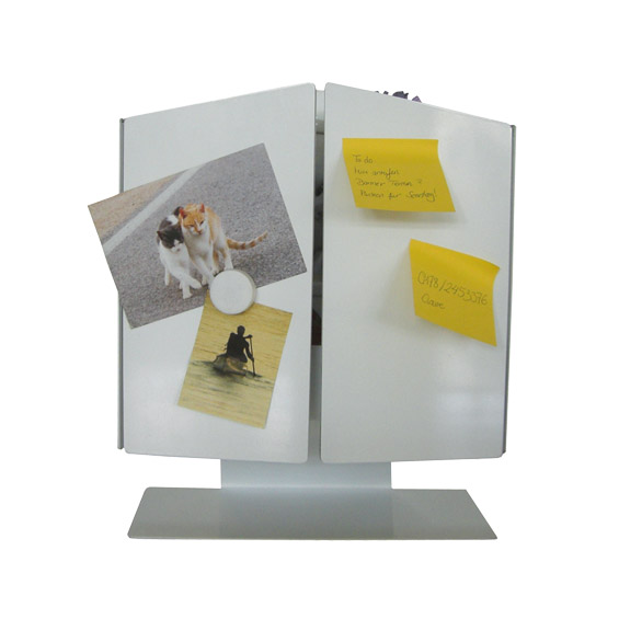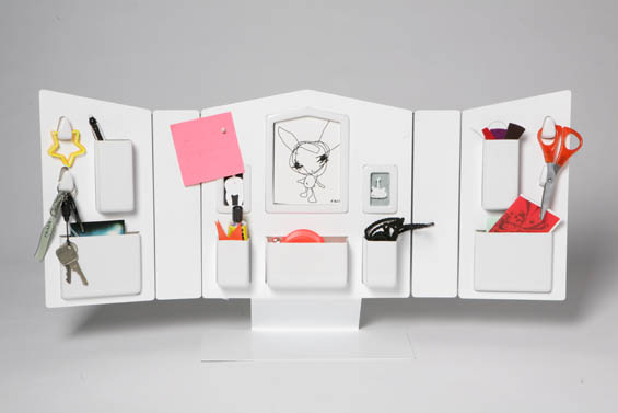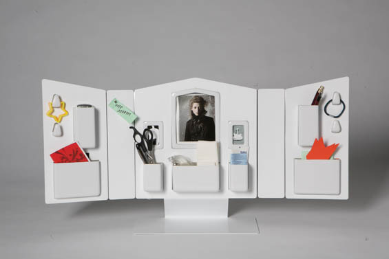 “Mento” is a storage device for the office or home. It is shaped like an altar for a desk or table top and provides a worthy display (and hiding) space for all the odds and ends and treasures that seem to pile up. Everybody tends to personalize the workplace with pictures, favorite pens and all kinds of other objects that mean something to them. Here, all these things can be displayed - or also kept secret when “Mento” is closed.