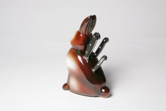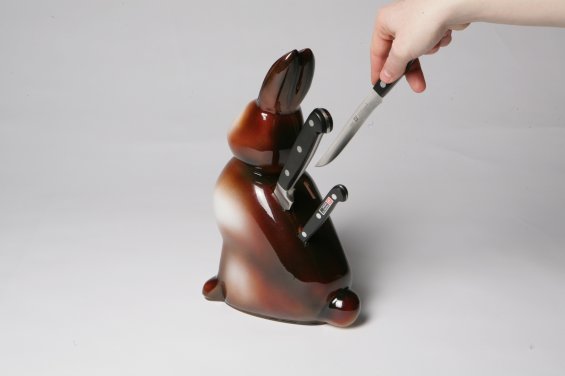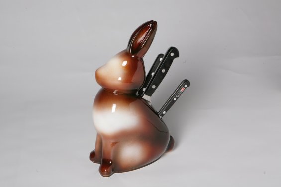 This is a knife-block shaped like a rabbit with the knives sticking out of its back. It reminds you that before some culinary delight, an aggressive act may have taken place.